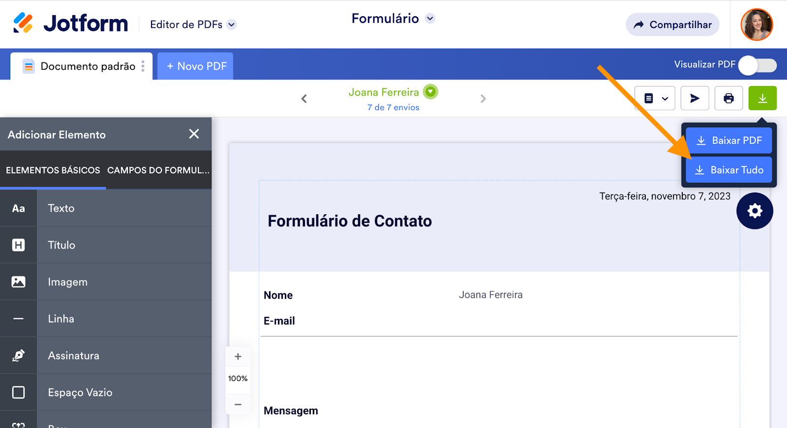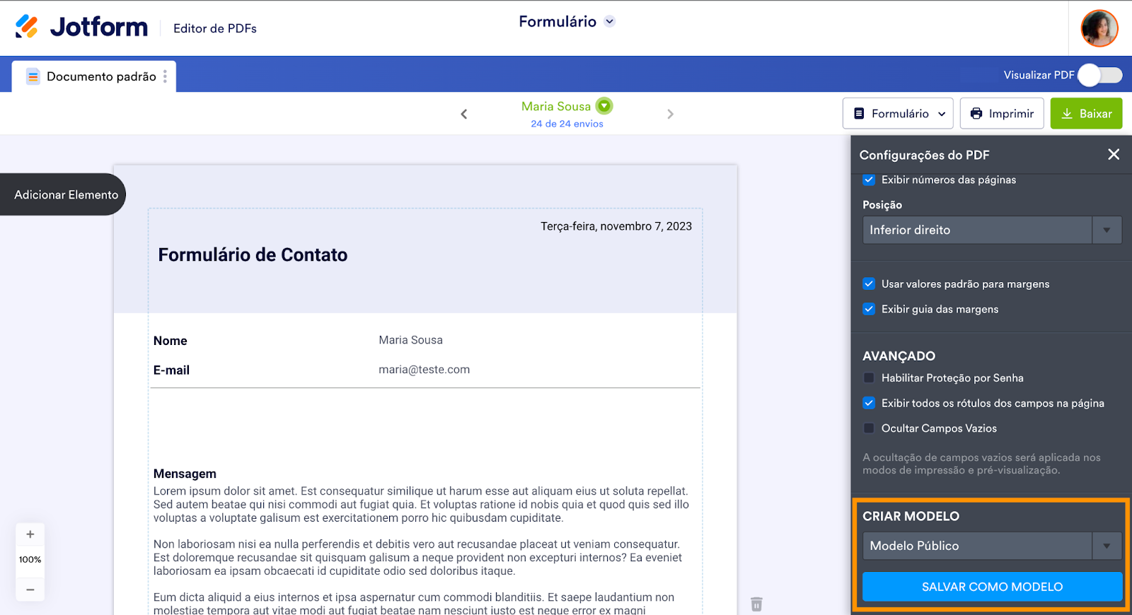 Isso pode ser particularmente útil caso você precise salvar uma cópia em PDF de um formulário submetido para seus registros ou compartilhá-la com membros de sua equipe.