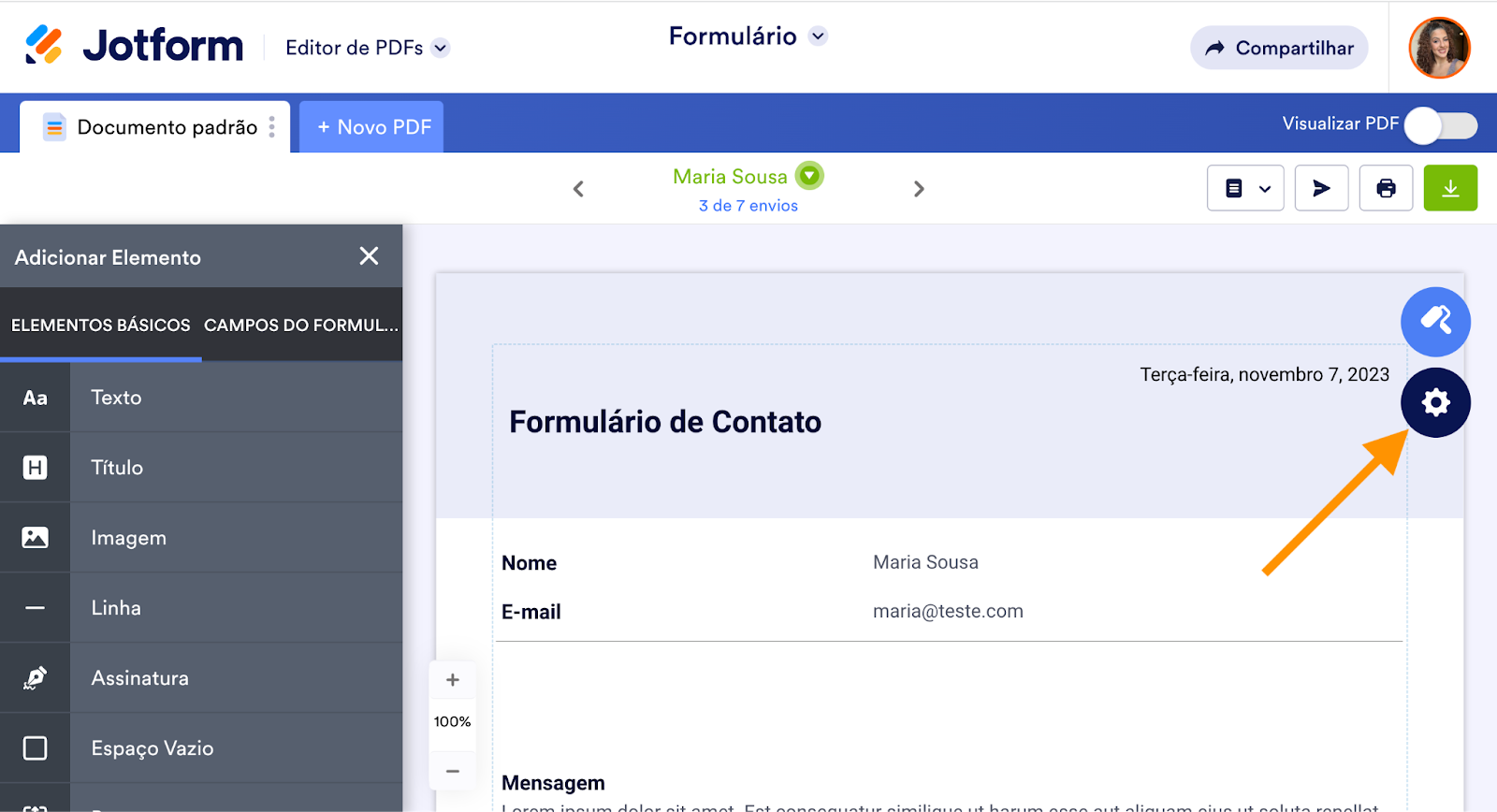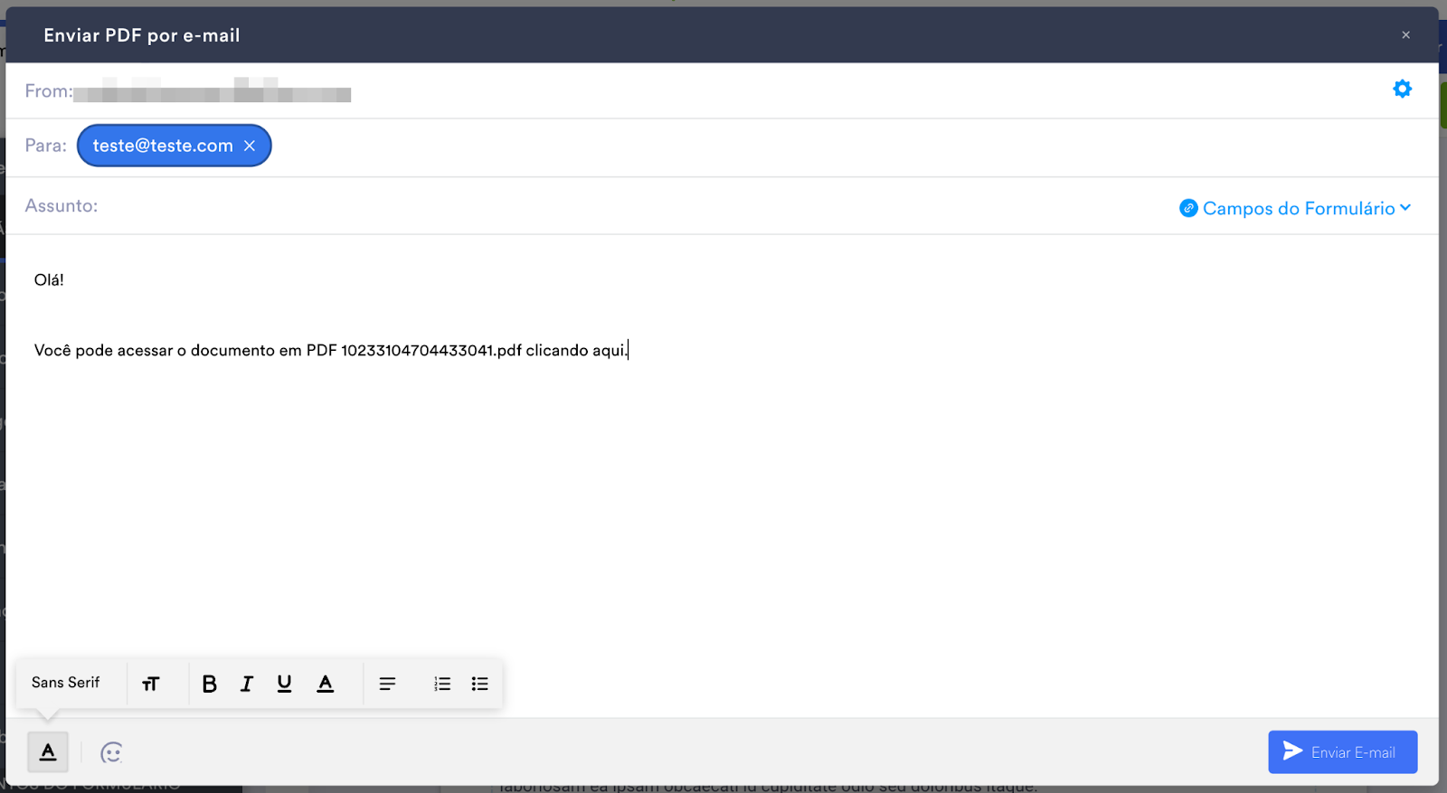 O Editor de PDFs Jotform também permite enviar seu PDF em um e-mail dedicado, além de personalizar a mensagem enviada juntamente com o mesmo.