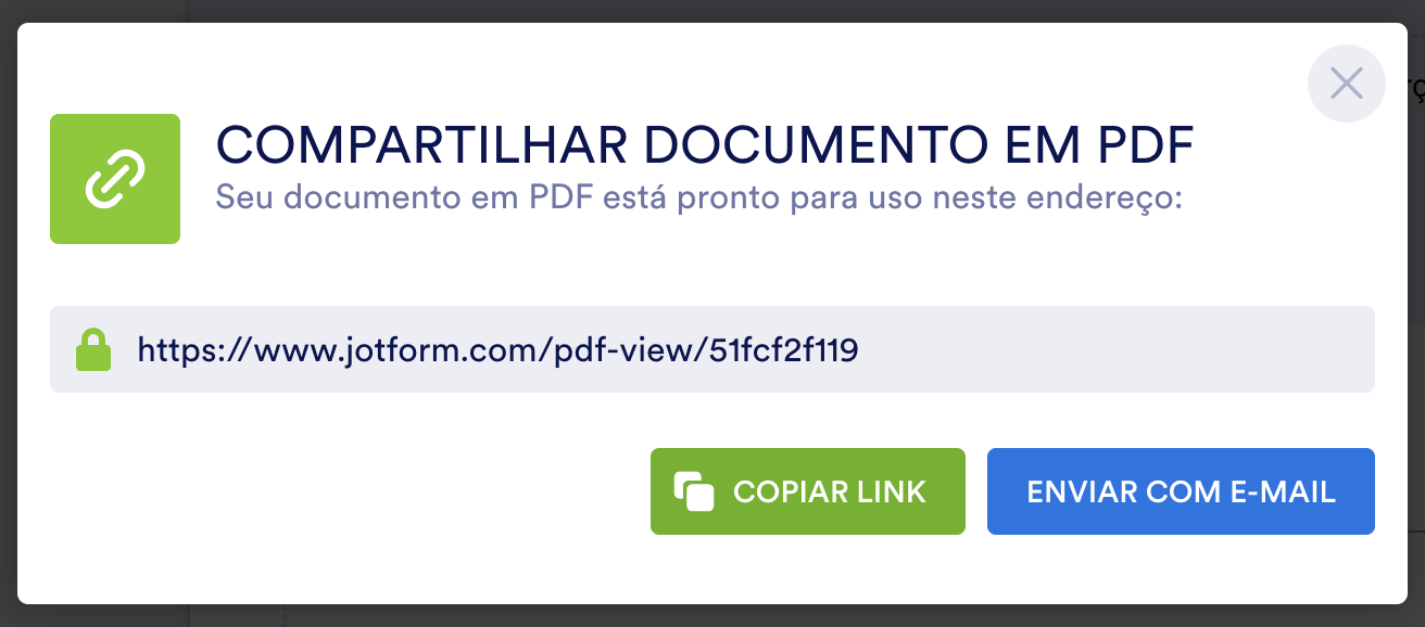 A melhor parte é que ambas as opções de compartilhamento são executadas dentro do Editor de PDFs Jotform, logo, você pode continuar trabalhando uma vez que seu PDF for compartilhado.