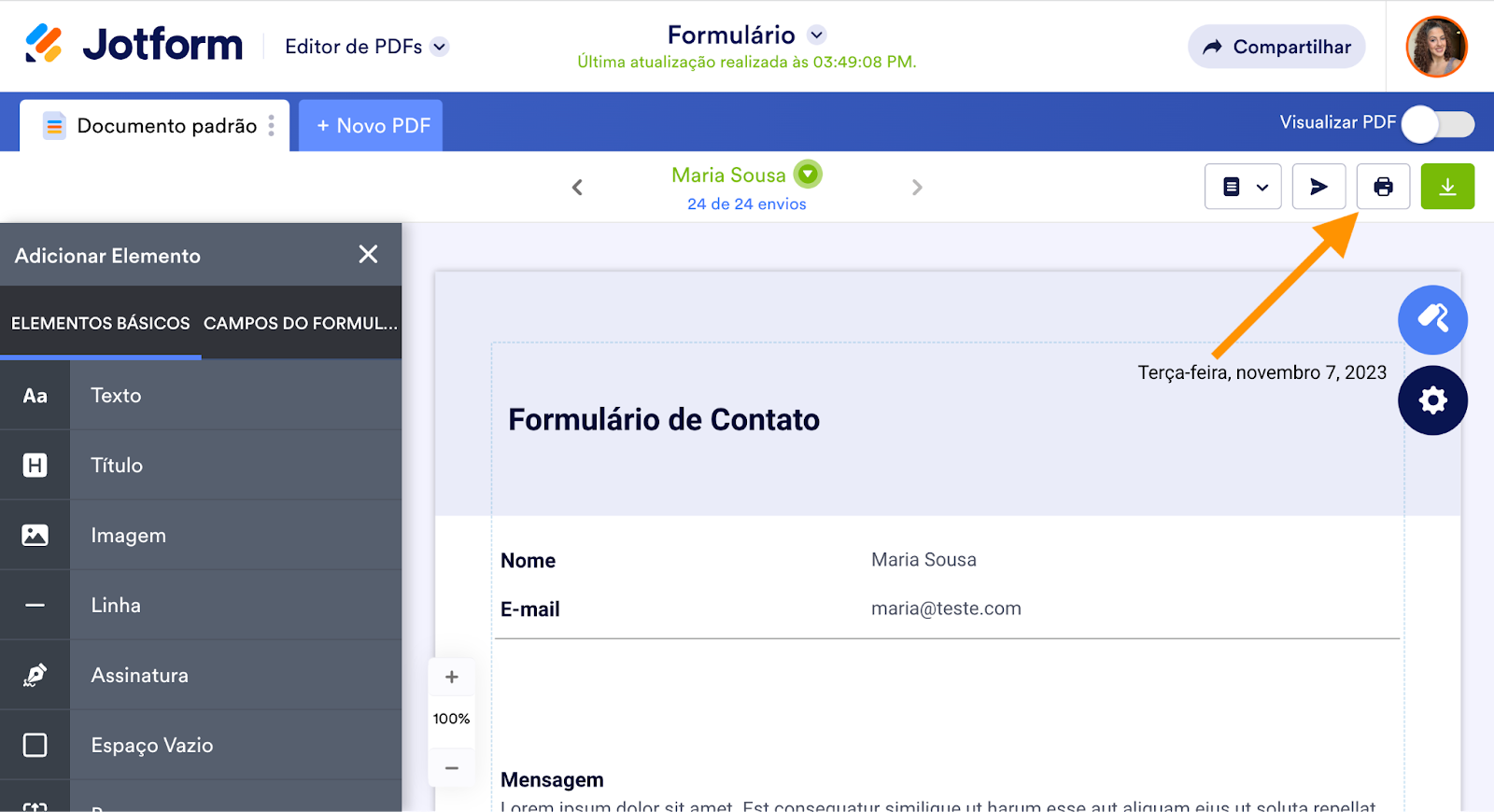 Para isso, você pode imprimir seu PDF rapidamente enquanto estiver usando o Editor de PDFs Jotform.