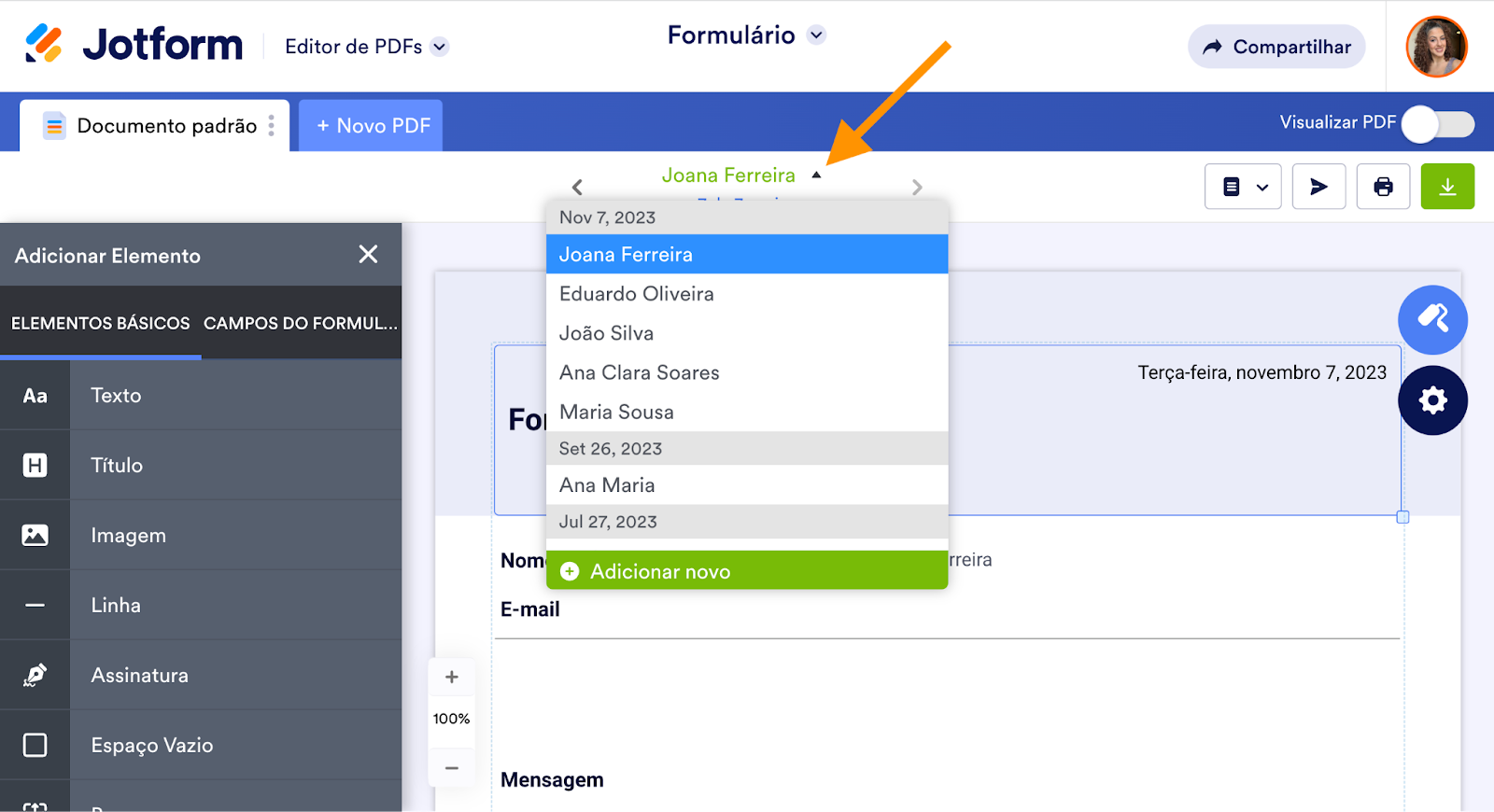Isso elimina a necessidade de sair do Editor de PDFs Jotform, navegar pelo painel da sua conta e abrir outro envio do mesmo formulário no Editor de PDFs Jotform. Localizar o envio que você deseja abrir também é bastante fácil, pois a lista suspensa do Editor de PDFs Jotform é organizada por data e pela ordem na qual os formulários foram submetidos.