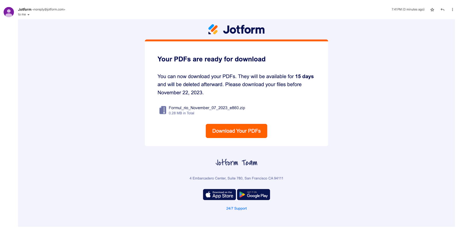 Como seu documento personalizado está vinculado a um formulário, todos os envios baixados terão o mesmo formato definido em seu PDF. Todos os envios serão comprimidos em um arquivo .zip e enviados para o endereço de e-mail associado à sua conta Jotform.