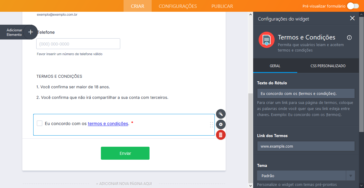 O widget Termos e Condições pode encurtar seus formulários fornecendo uma caixa de confirmação com uma linha de texto e um link externo para o texto completo dos termos. Este widget, por sua vez, exige que todos os respondentes do seu formulário marquem a caixa antes de submeterem seu formulário – assegurando-o de que as pessoas leram e entenderam sua declaração.