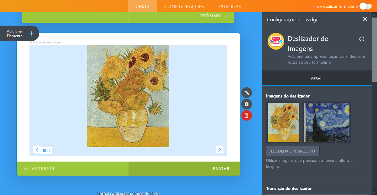 O Deslizador de Imagens o permite não apenas adicionar uma galeria de fotos ao seu formulário, mas também controlar como suas imagens são exibidas. Após adicionar o widget e fazer o upload de suas fotos, você pode definir preferências para a transição de imagens e determinar por quanto tempo cada uma será exibida.
