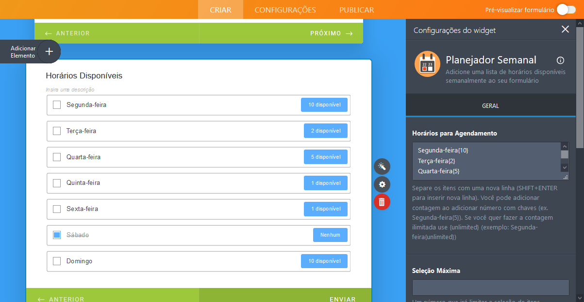 Basta adicionar o widget ao seu formulário e inserir as informações necessárias, como datas, horários, atividades ou eventos. Finalize configurando o número máximo de reservas disponíveis.