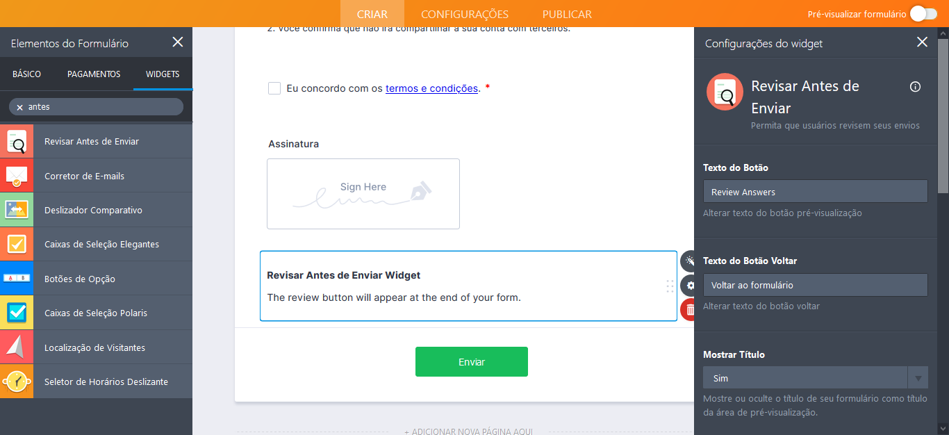 O widget Revisar Antes de Enviar permite que as pessoas preencham um formulário e revisem todas as informações antes de enviá-las.
