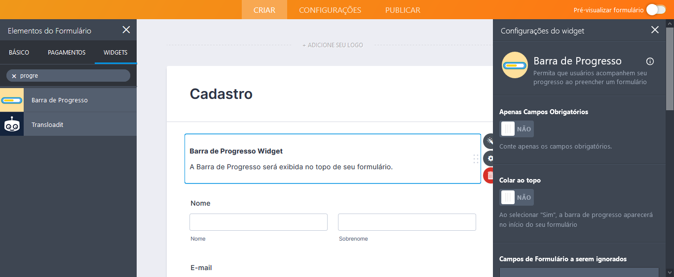 Este é um problema comum que o widget Barra de Progresso da Jotform consegue resolver apenas monitorando o progresso de seu respondente enquanto este preenche um formulário. Seu progresso, por sua vez, é exibido em uma barra de status acima do formulário, a qual o permite saber quantas informações foram preenchidas e quantas mais são necessárias.