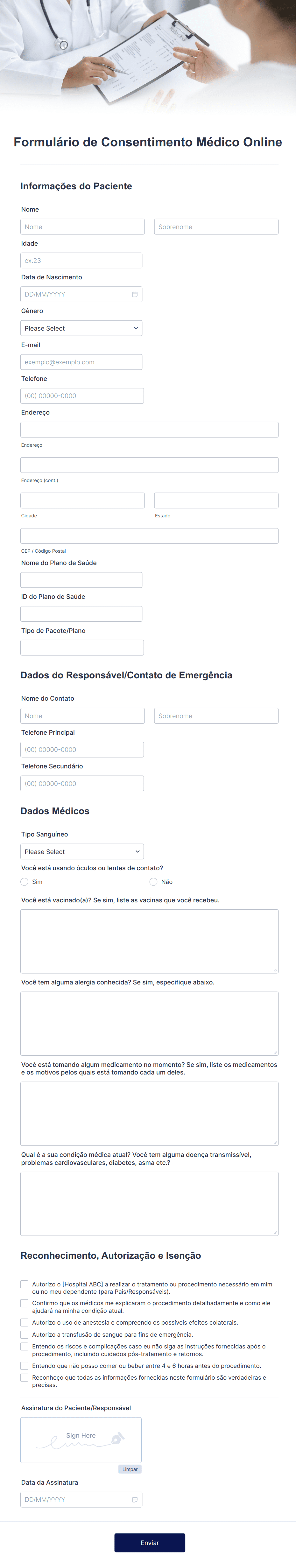 - Formulários de consentimento médico podem exigir informações detalhadas sobre procedimentos, riscos e contatos de emergência.
