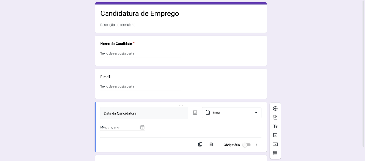 - Dê um título adequado ao seu formulário, como “Candidatura de Emprego”, e adicione um campo de descrição, se desejar.