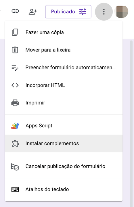 Pode levar alguns minutos para que o menu do Formfacade fique disponível. Talvez seja necessário recarregar a página do formulário. Caso o menu não apareça, recarregue a página e aguarde um momento.