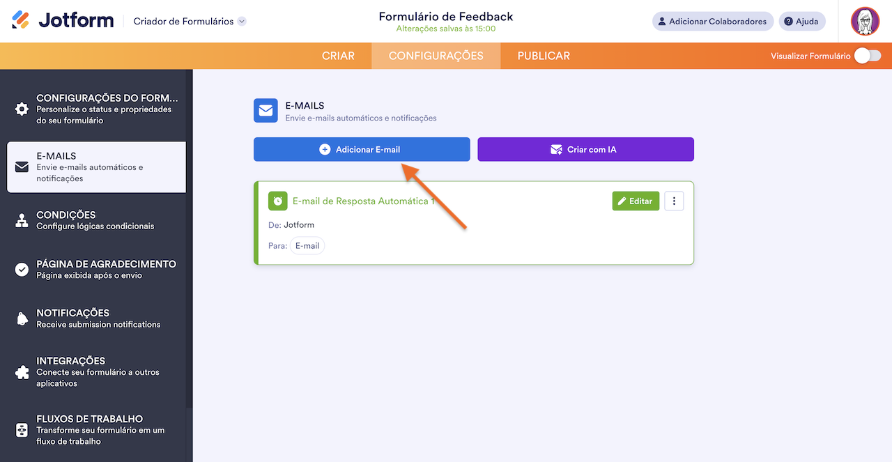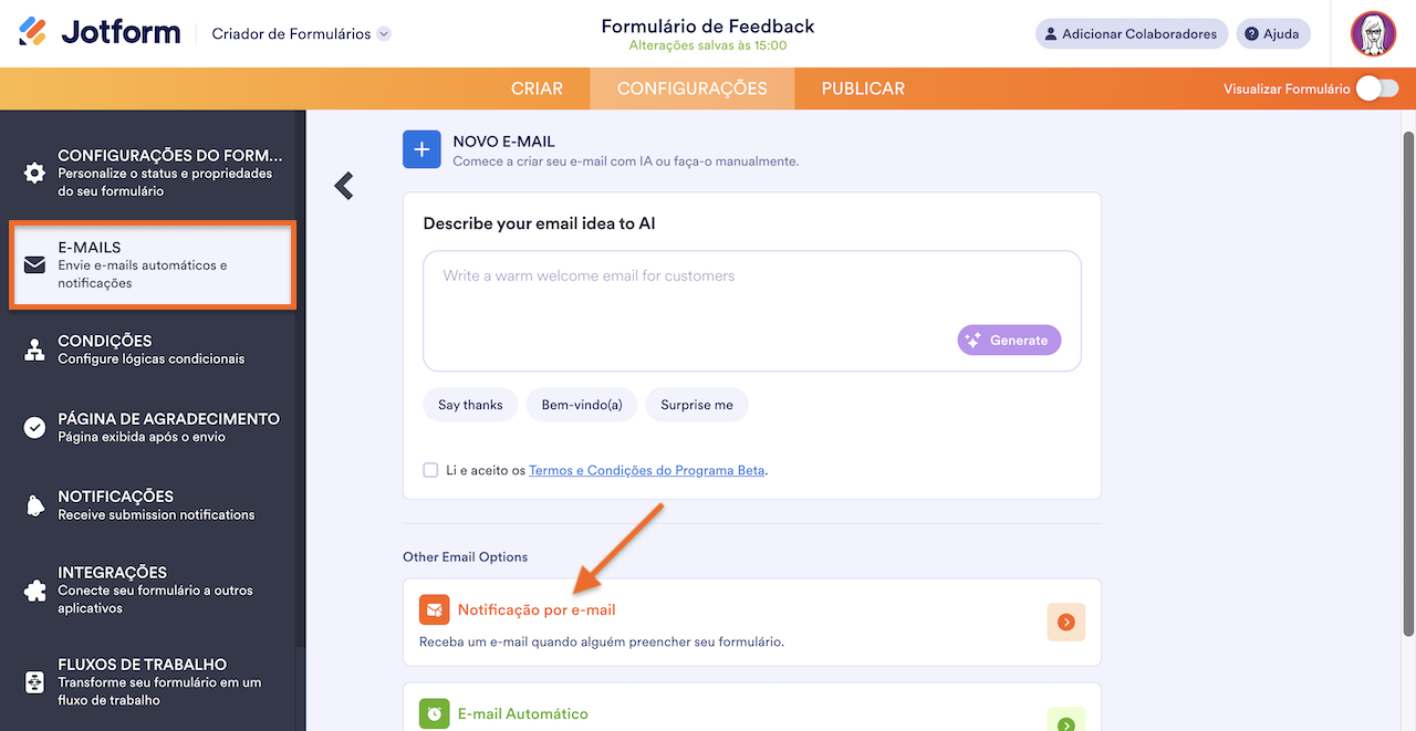 Jotform também facilita o envio de notificações automáticas por e-mail sempre que alguém preenche um formulário. Basta seguir estes passos: