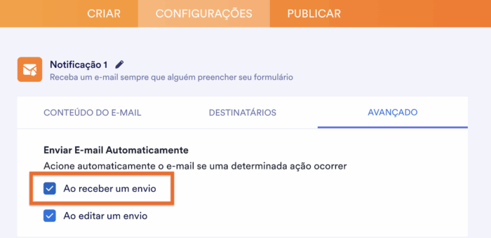 As notificações por e-mail vêm com um modelo predefinido e personalizável, mas todos os campos de resposta são exibidos no corpo do e-mail por padrão. Você pode adicionar destinatários específicos na aba Destinatários. Na aba Avançado, certifique-se de que a opção Enviar e-mail automaticamente > Ao receber um envio esteja marcada para garantir que todos os colaboradores e respondentes recebam as notificações.