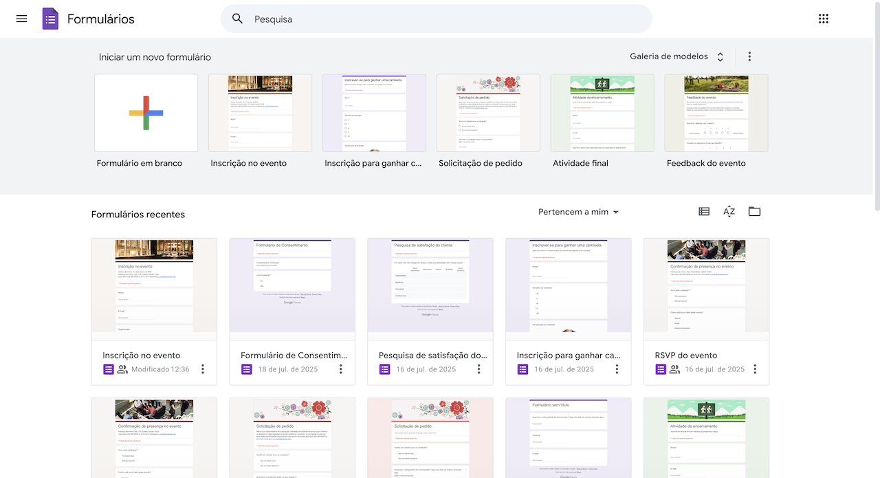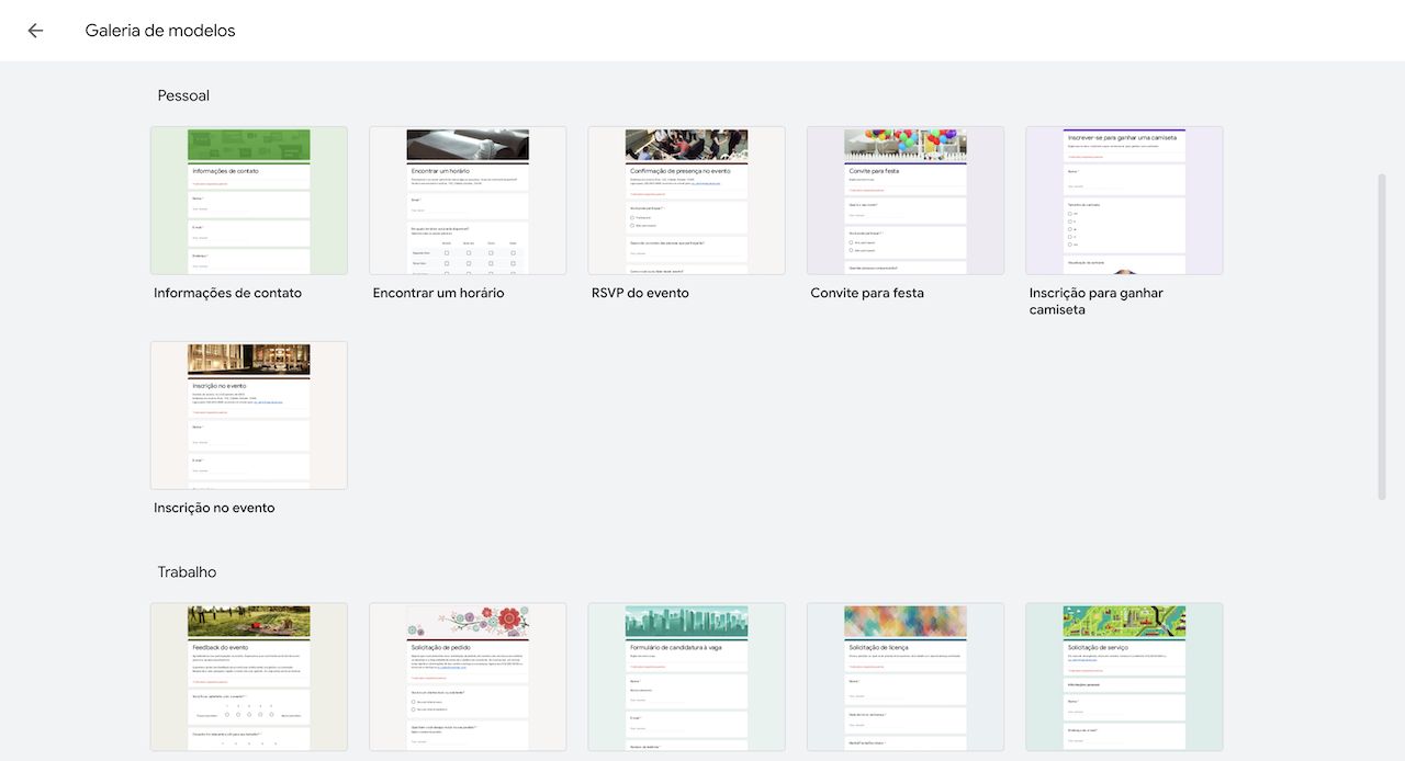 Para quem quer um ponto de partida, o Formulários Google oferece uma ampla variedade de modelos, incluindo formulários de candidatura a emprego, formulários para inscrições em eventos e formulários de feedback de clientes, entre outros. Para acessar a Galeria de Modelos, clique no botão “Galeria de modelos” localizado no canto superior direito da página. Depois de encontrar o modelo que atende às suas necessidades, clique nele e personalize o formulário conforme necessário.