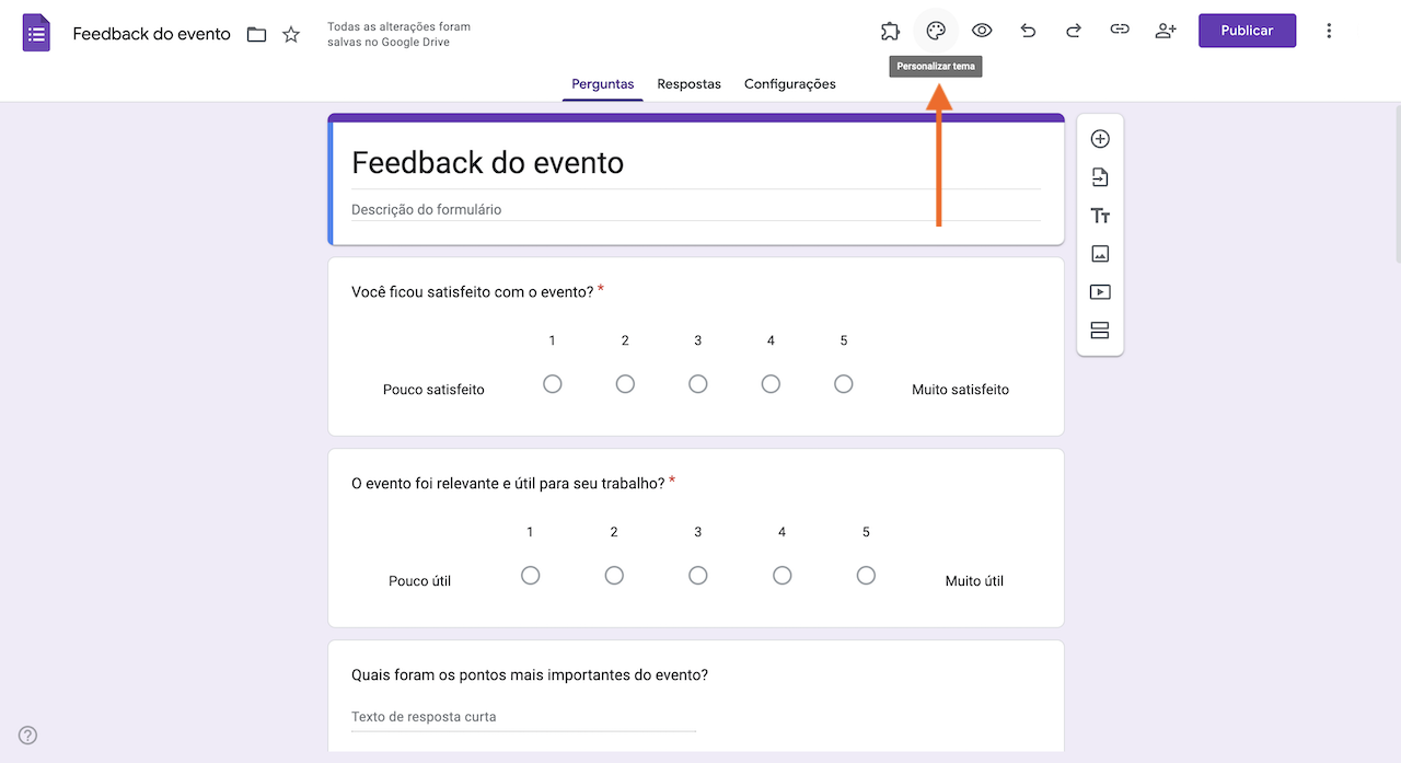 Definir o esquema de cores adequado para seu formulário pode criar uma experiência visual atraente para os usuários. No Formulários Google, você pode escolher entre temas predefinidos ou criar um tema personalizado. Para modificar o tema, clique no ícone de paleta (Personalizar tema) no canto superior direito da página do formulário. A barra lateral “Tema” será aberta, permitindo que você personalize suas cores.