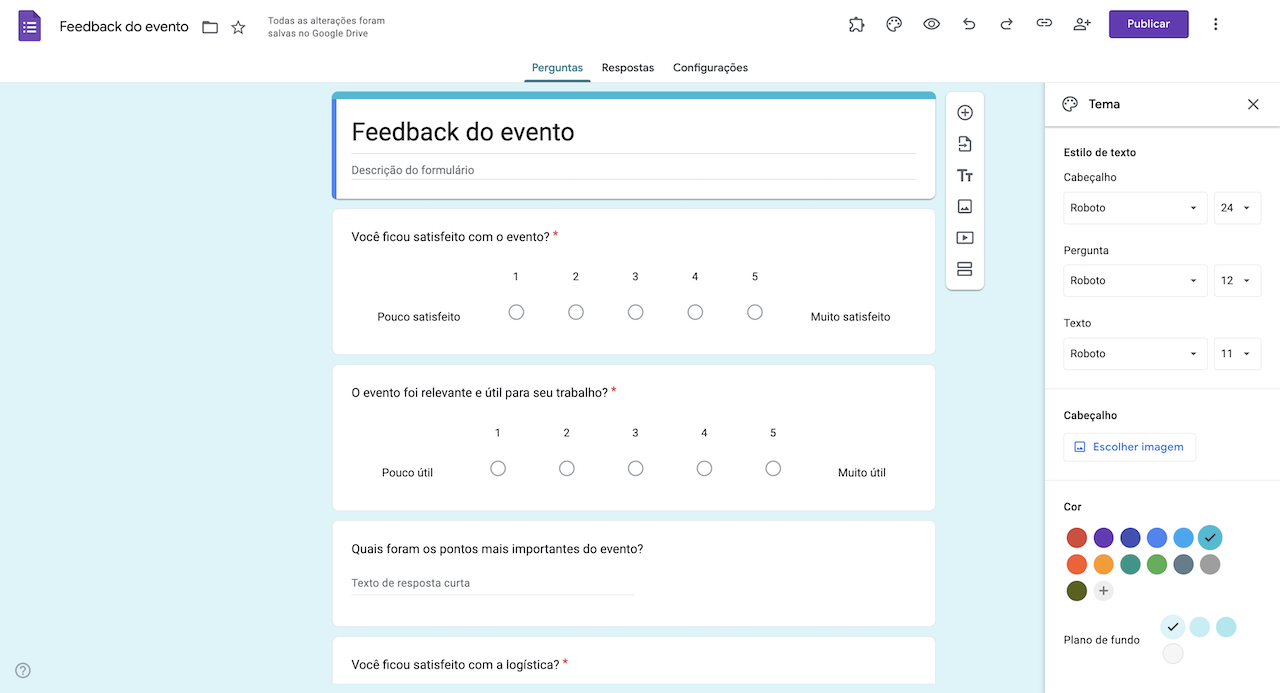 Um formulário atraente não apenas parece profissional, como também incentiva as pessoas a preenchê-lo. Personalizar a aparência do seu formulário do Google é simples e inclui mudar o tema de cores, adicionar imagens e ajustar estilos de fonte.