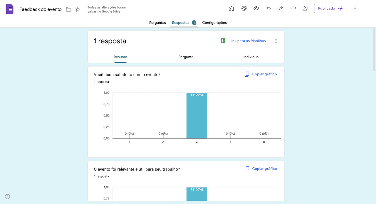 Para acessar os dados de envios ao formulário, basta abrir a guia “Respostas” dentro do seu Formulários Google. Você pode escolher visualizar as respostas diretamente no Formulários Google ou vincular o formulário a uma planilha do Google (Link para as Planilhas). A análise de dados pode fornecer insights sobre as preferências, opiniões e necessidades do seu público-alvo. Essas informações podem orientar a tomada de decisões e levar a melhorias nos seus serviços.