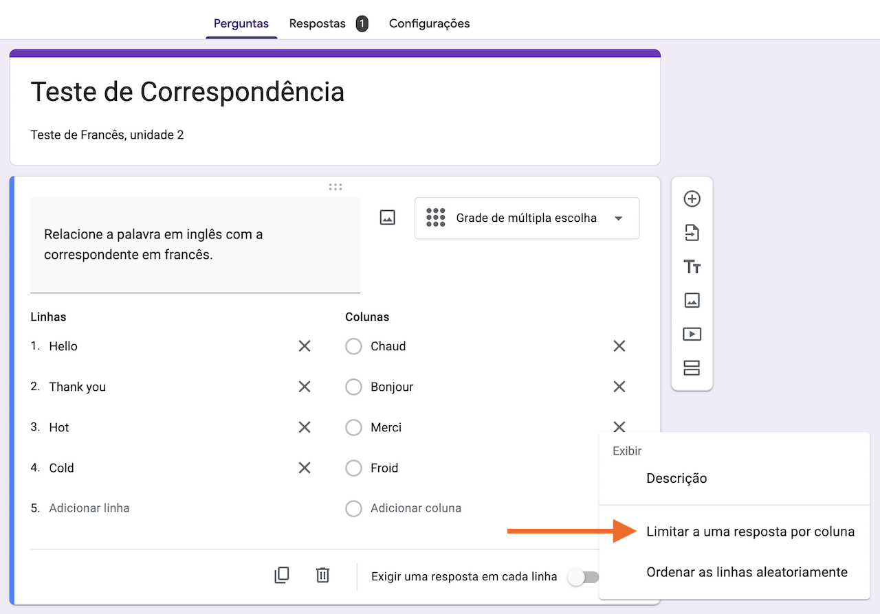 - Clique no menu Mais opções (três pontos verticais). Selecione Limitar a uma resposta por coluna.