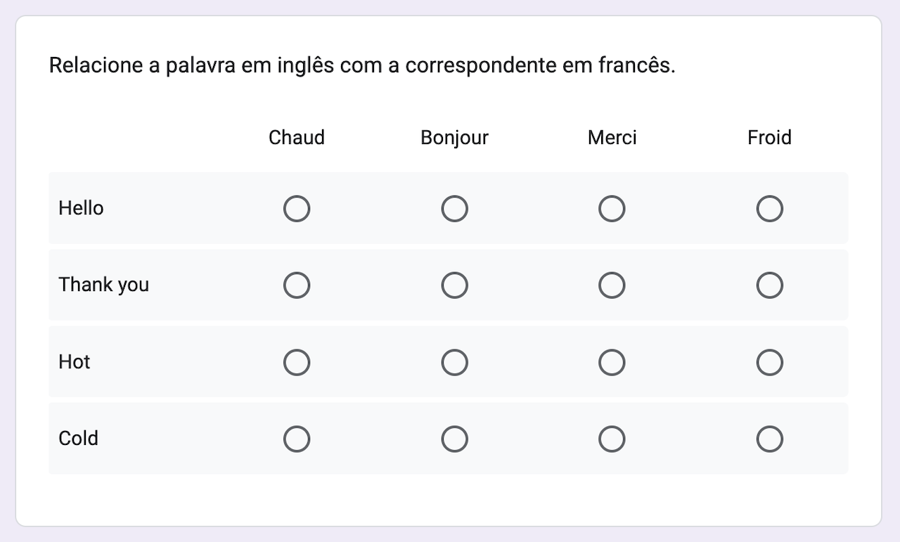 Criar uma questão de correspondência no Formulários Google é complicado, pois esse tipo de pergunta não está disponível no menu suspenso. As instruções abaixo apresentam uma solução que resolve esse problema, essencialmente criando uma grade que funciona como uma questão de correspondência: