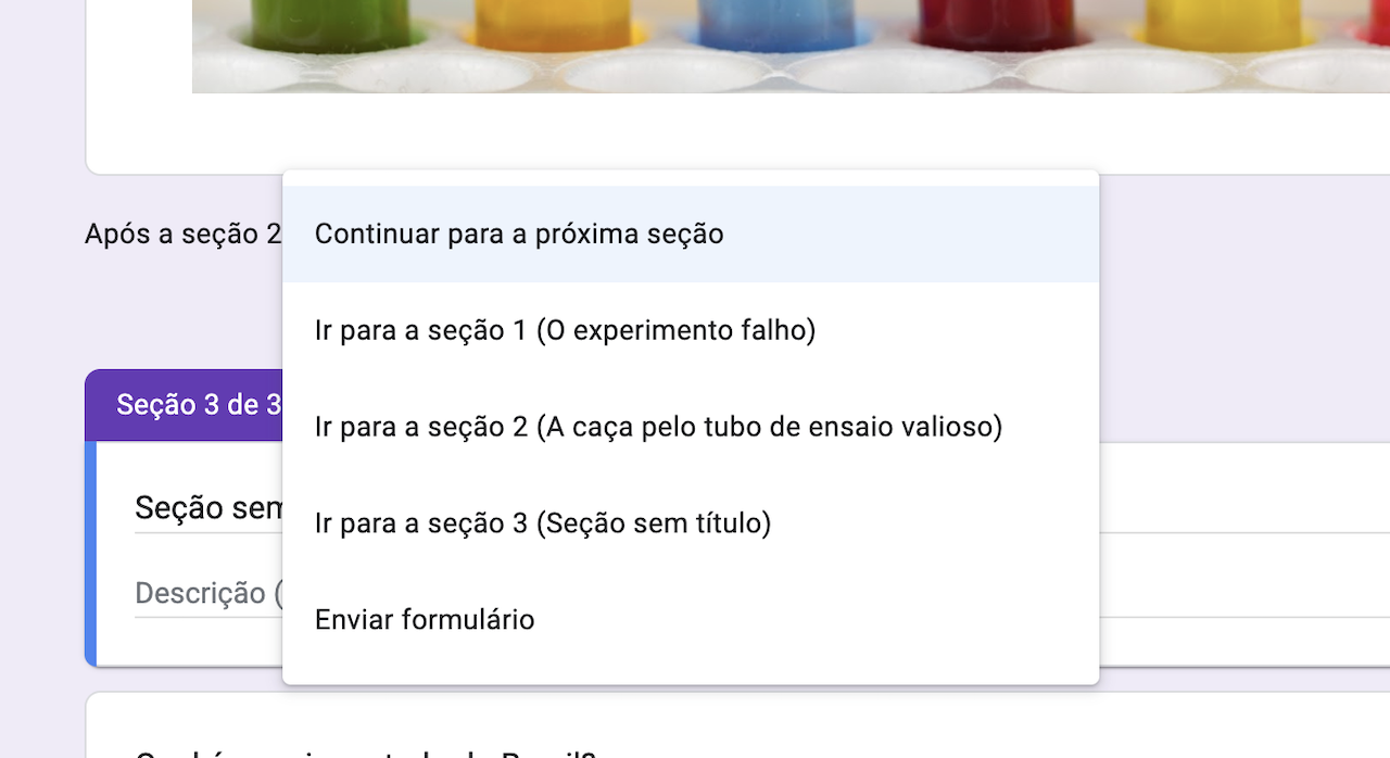 Para alterar o tipo de pergunta, clique no menu suspenso à direita da pergunta. Uma lista de tipos de pergunta aparecerá, como múltipla escolha, resposta curta, caixas de seleção, entre outros. Escolha a opção que melhor atende às suas necessidades.
