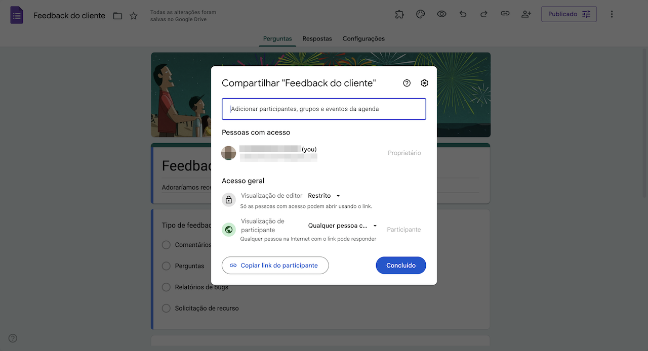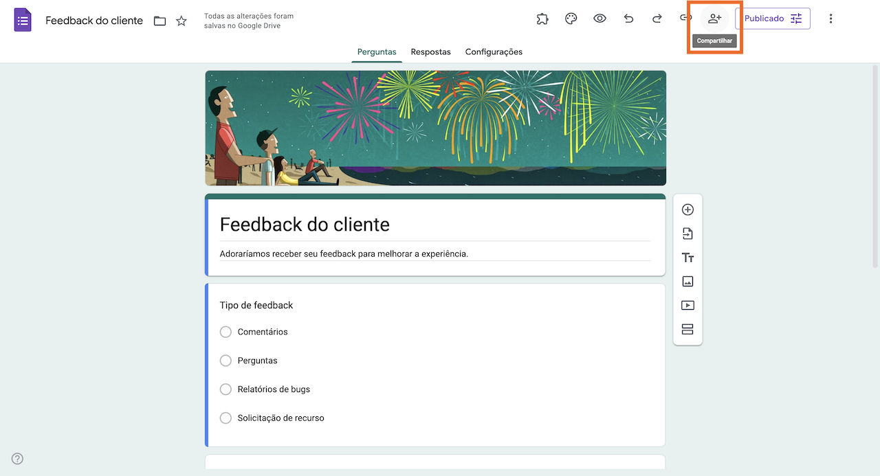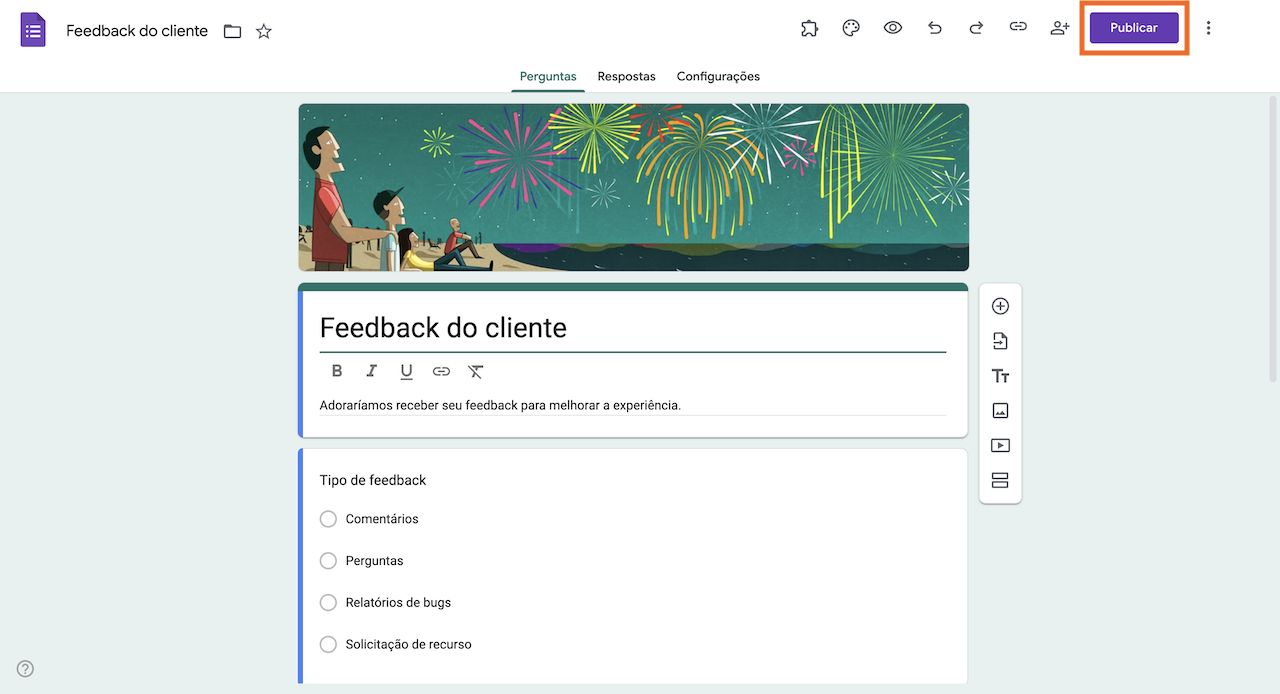 - Após personalizar o formulário, clique em Publicar no canto superior direito para que os respondentes possam acessar o formulário.