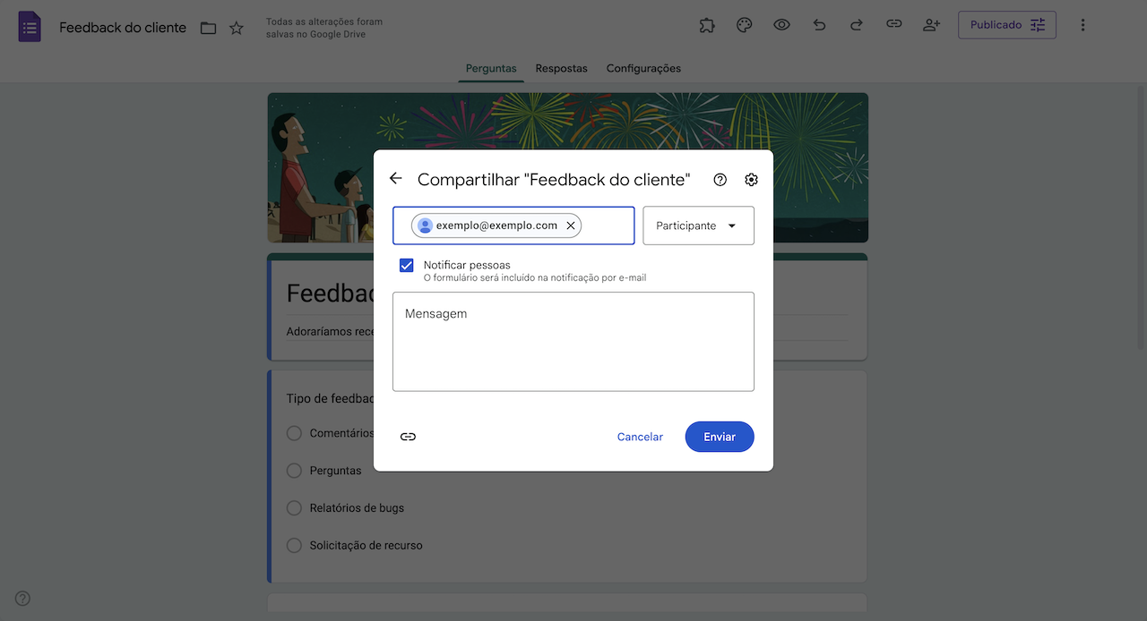 - Para enviar o formulário automaticamente em uma notificação por e-mail ao compartilhá-lo, marque a caixa ao lado de Notificar pessoas. Ao notificar os respondentes ao publicar o formulário, o e-mail enviado a eles incluirá o próprio formulário.