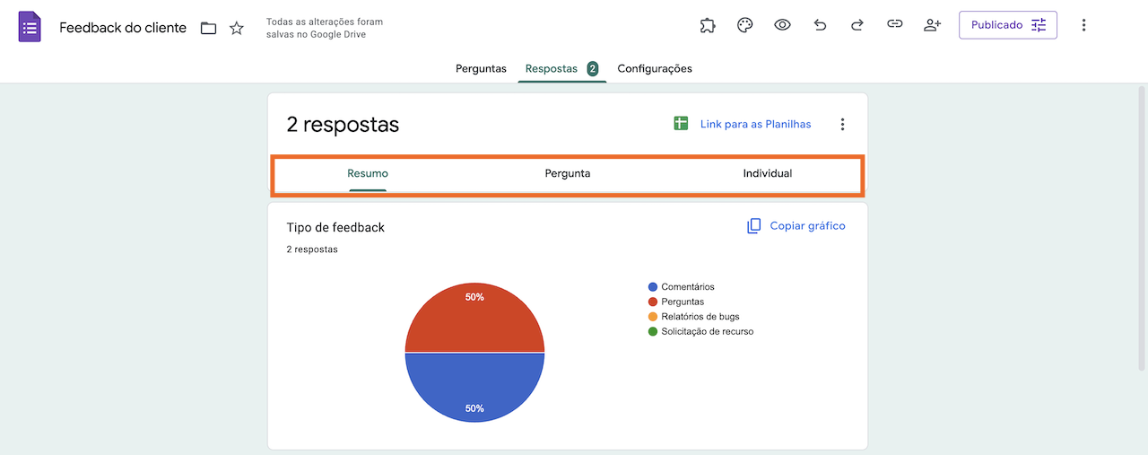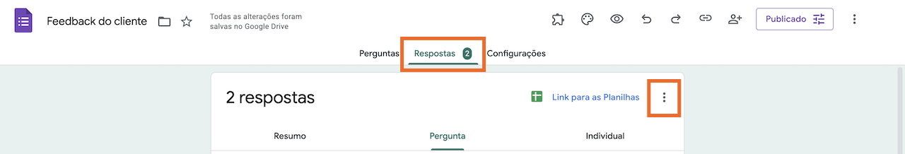 Se você quiser apenas visualizar todas as respostas, clique na aba Respostas. É possível ver as respostas em três seções diferentes: