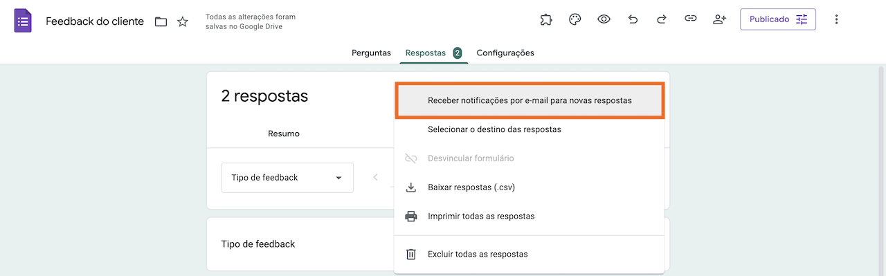 Opção 1: Ativando notificações por e-mail para respostas ao formulário