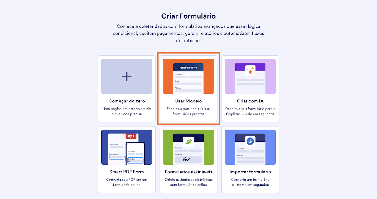 - Escolha um modelo pronto ou crie seu próprio formulário do zero. Mantendo o exemplo anterior, selecionaremos Usar Modelo.