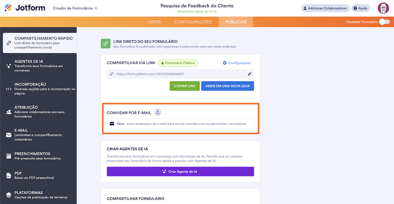 É isso! Você criou com sucesso um formulário usando Jotform e o compartilhou por e-mail com seus respondentes.