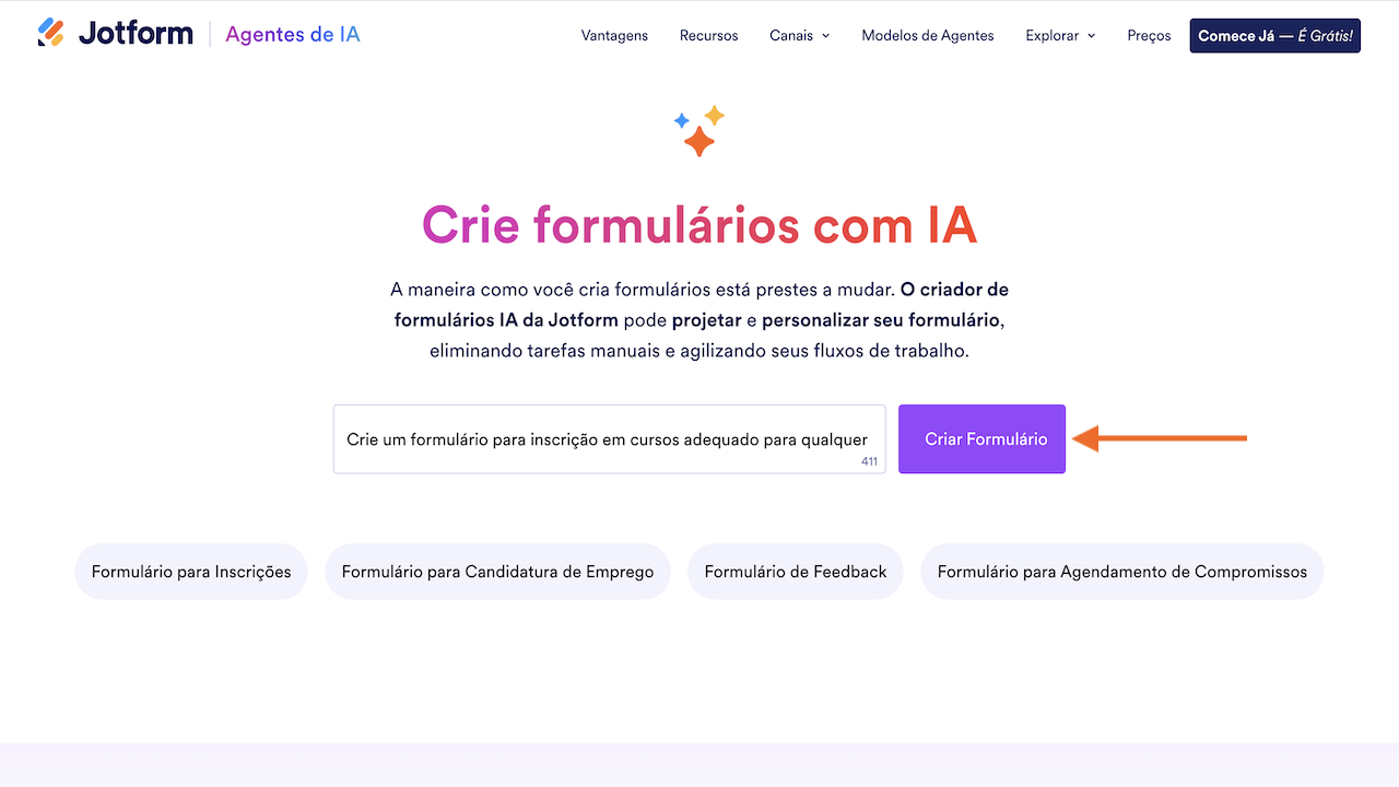 Criar um formulário usando a IA da Jotform é incrivelmente simples. A Jotform oferece um criador de formulários com IA integrado que permite a criação de formulários utilizando comandos de texto.