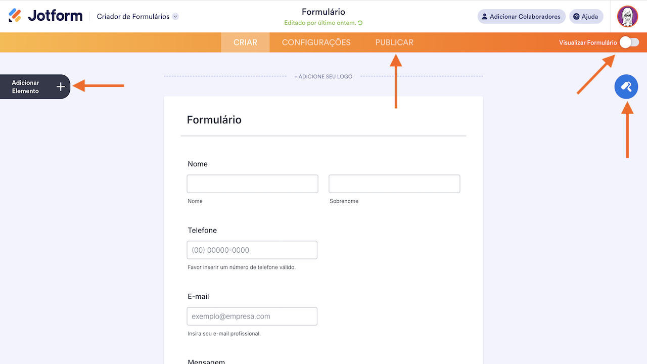 Na Jotform, você pode usar um criador de formulários nativo com tecnologia de IA para criar instantaneamente um formulário a partir de um comando de texto. Depois, é possível personalizar esse formulário com facilidade usando a interface intuitiva do Criador de Formulários. Além disso, você conta com uma ampla variedade de ferramentas que ajudam a atender diferentes necessidades do seu negócio — incluindo a possibilidade de integrar IA aos processos de análise e gerenciamento das respostas dos seus formulários.