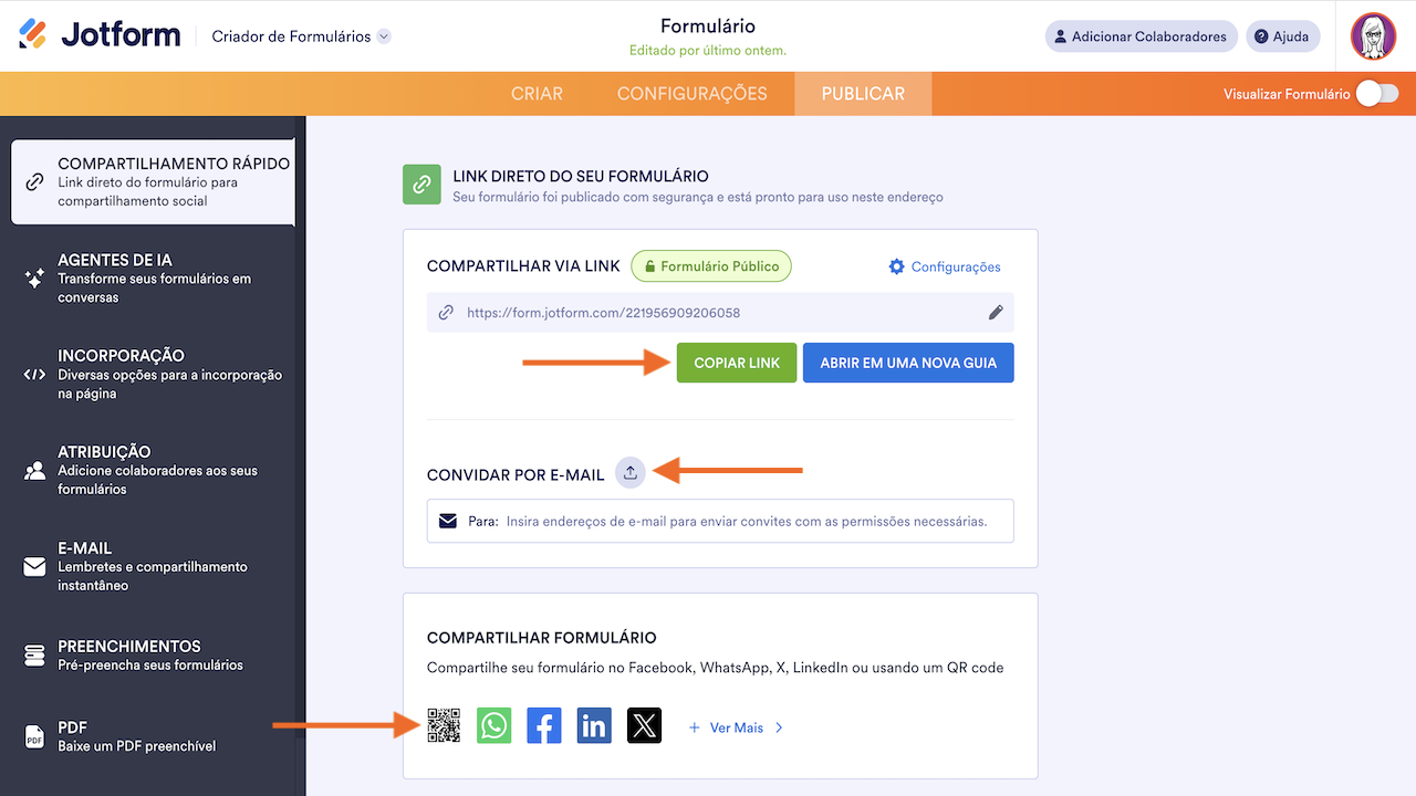 - Escolha seu método de compartilhamento preferido. Você pode copiar o link do formulário, enviá-lo por e-mail, compartilhar nas redes sociais, copiar seu código de incorporação, entre outras opções.