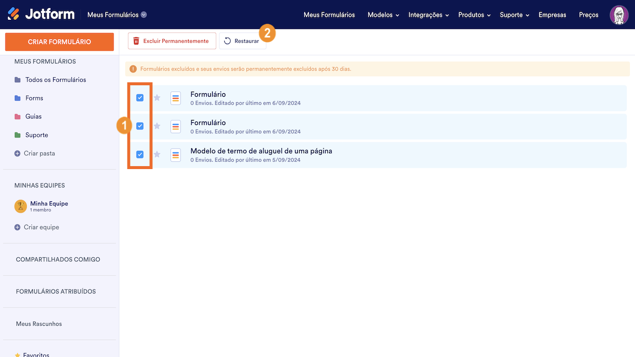 O sistema deleta automaticamente os formulários excluídos após 30 dias. Nesse caso, você não poderá mais recuperá-los. Também não é possível restaurar formulários que foram intencionalmente removidos da pasta Lixeira.
