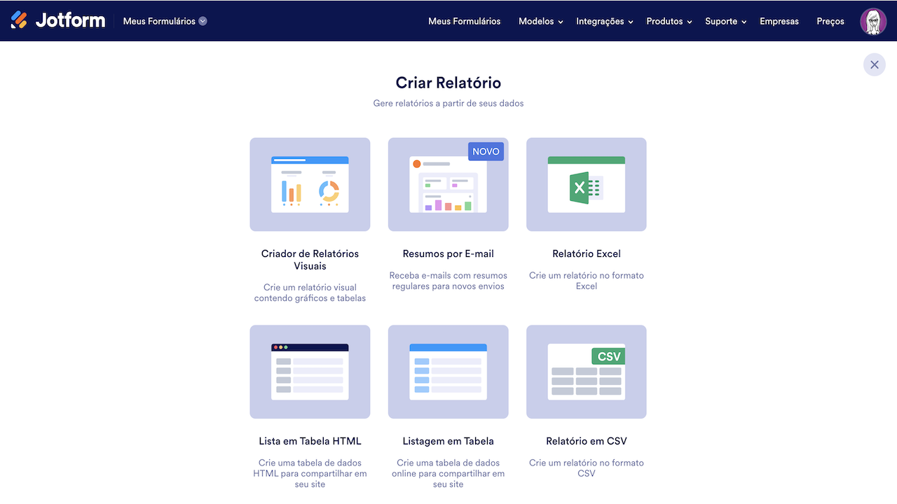 Feito isso, você verá uma lista de todos os tipos de relatórios disponíveis para o seu formulário.