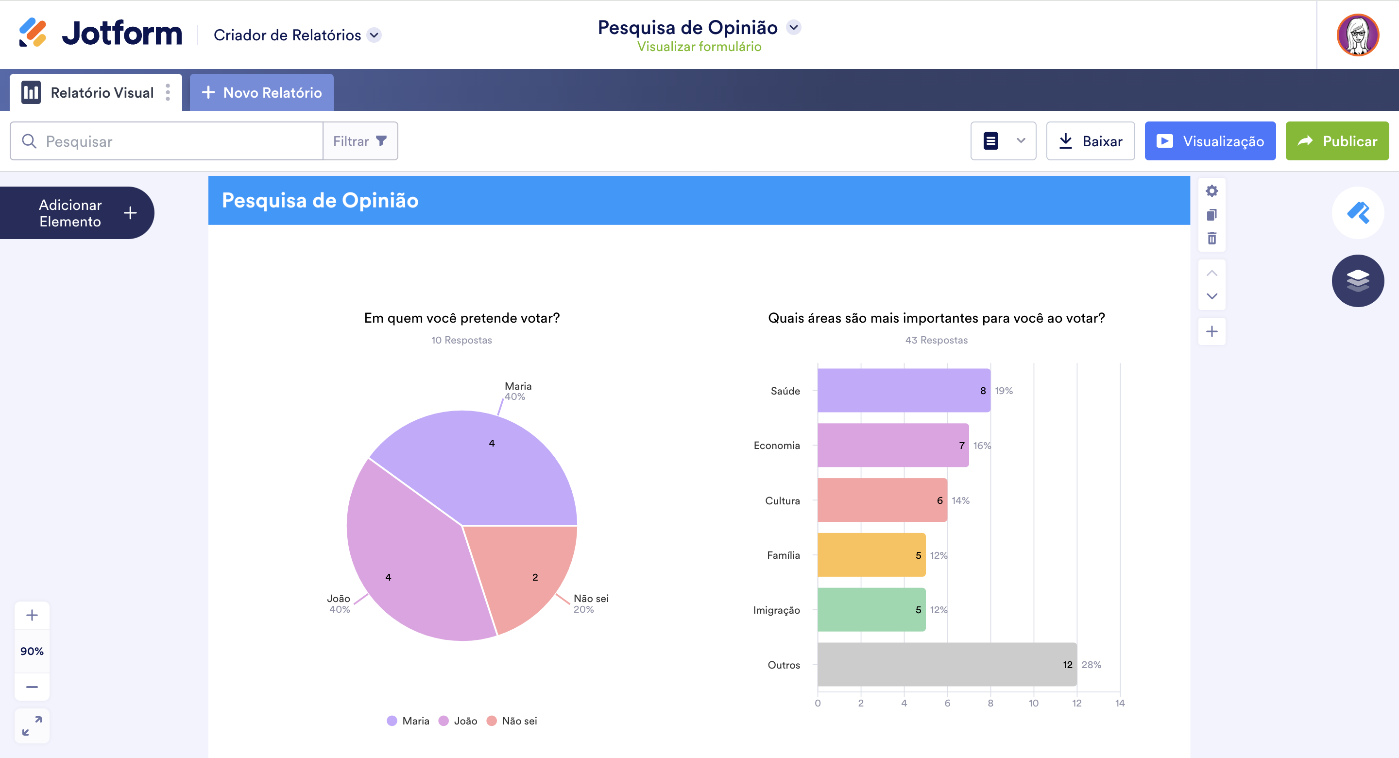 Você pode criar este tipo de relatório usando o novo Criador de Relatórios Jotform. Quer esteja buscando uma forma de mensurar desempenho, acompanhar o crescimento da sua empresa, analisar suas atividades de vendas ou interpretar dados de pesquisas com mais facilidade, os Relatórios Visuais oferecem todos os recursos de que você precisa para criar apresentações visualmente atraentes e prontas para apresentar na sua próxima reunião.