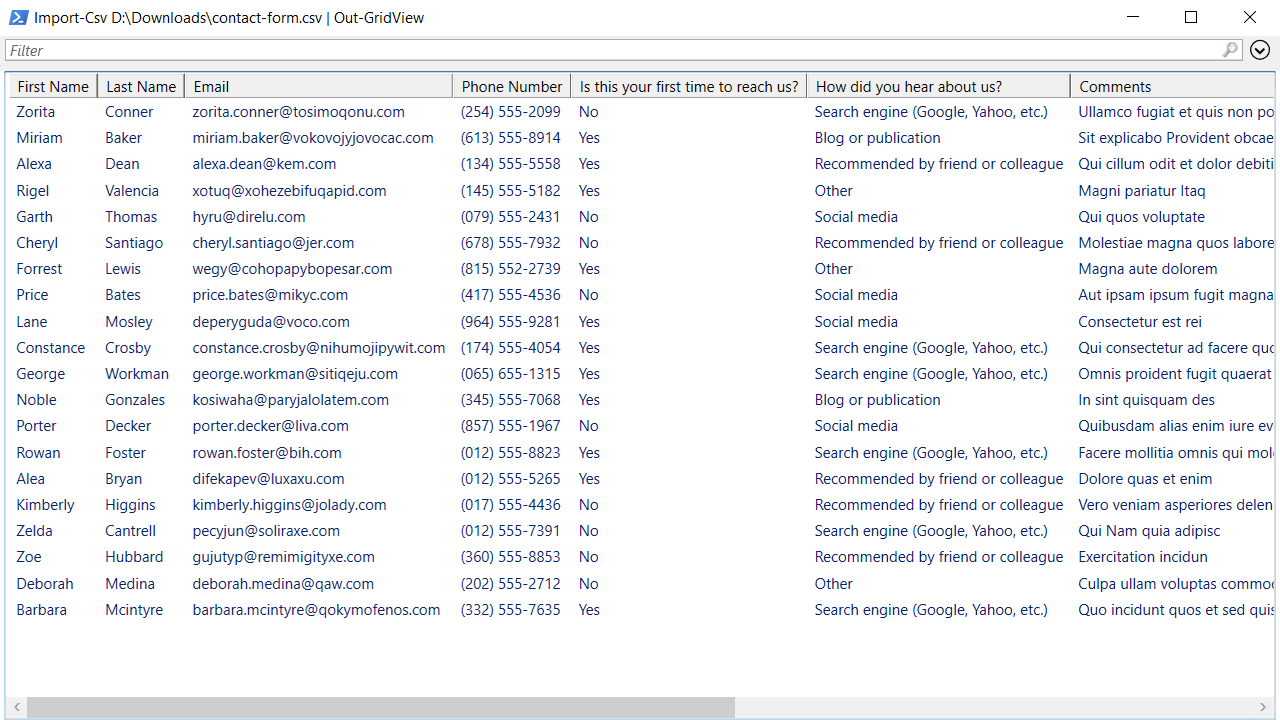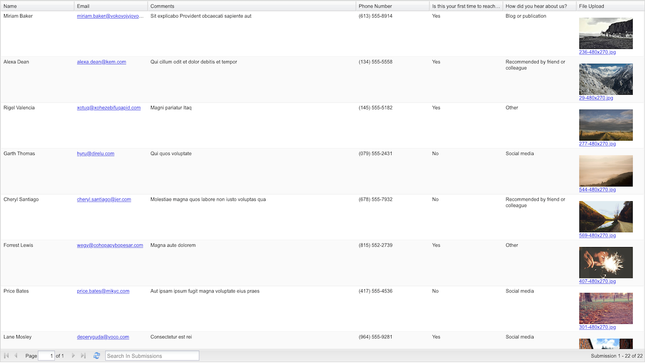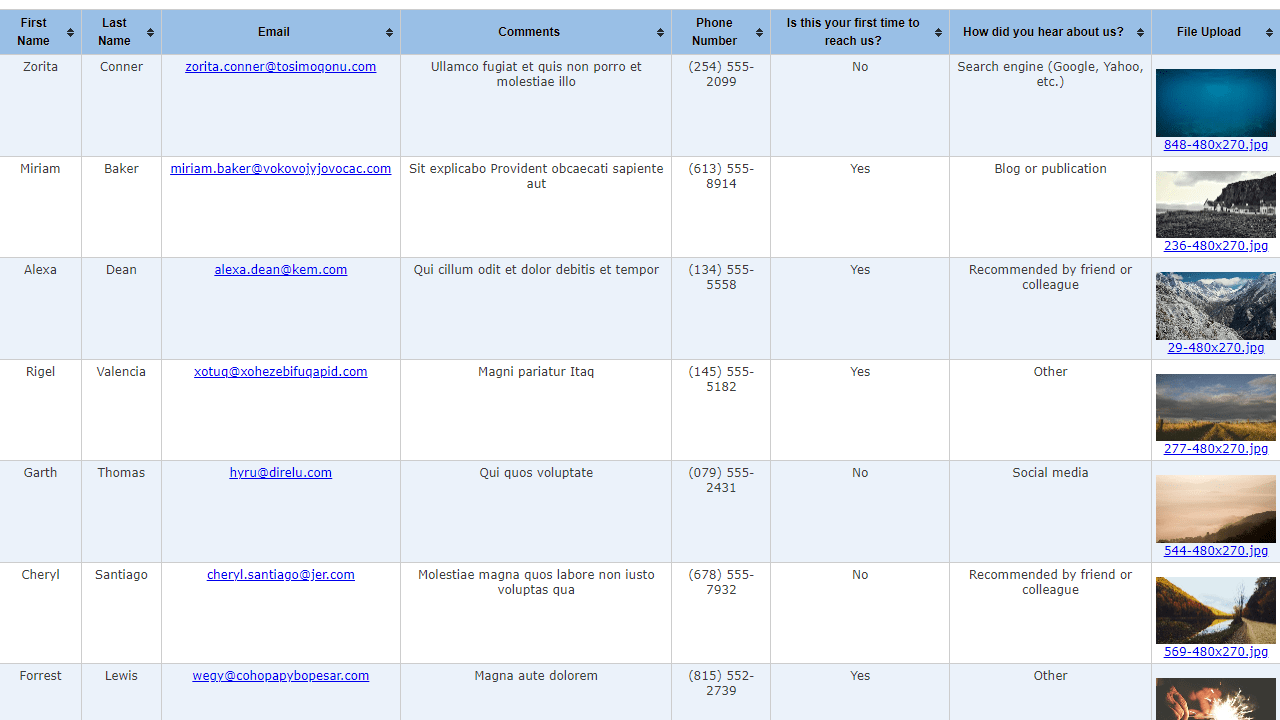 O relatório do tipo Lista em Tabela HTML se aplica aos usuários que desejam compartilhar os dados de seus envios e apresentá-los como uma tabela. Ele permitirá que você visualize rapidamente todos os envios aos seus formulários online. Você pode ordená-los por colunas clicando no nome da coluna.