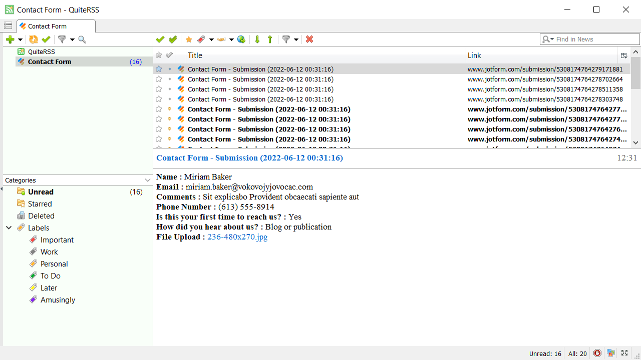 Confira abaixo a aparência de um feed RSS em um leitor, neste caso, no QuiteRSS.
