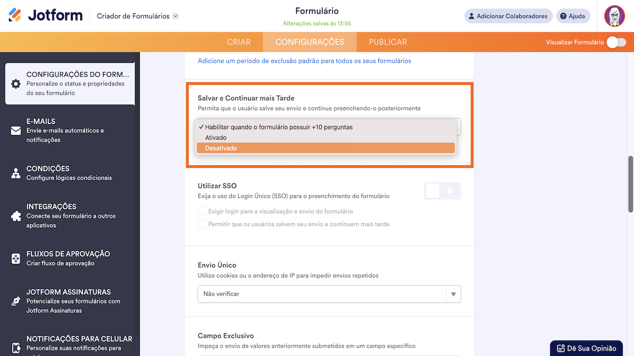 Para ativar o recurso para Continuar Formulários mais Tarde nos formulários Cartão:
