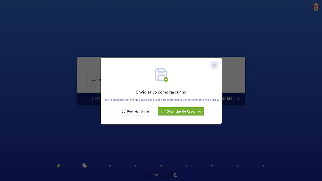 Selecionar o link para “pular” exibirá uma caixa de diálogo onde os respondentes do formulário poderão optar por receber o link da sessão em seu e-mail ou copiá-lo diretamente.