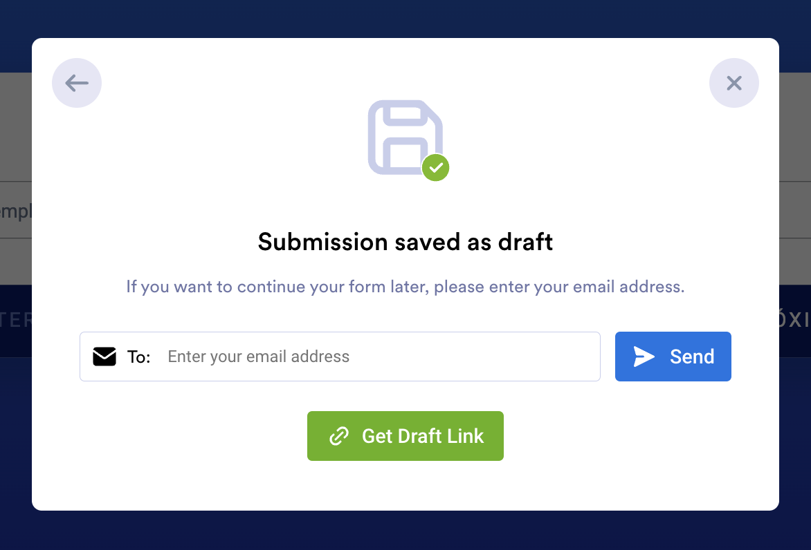 O recurso Salvar e Continuar Mais Tarde permite que os usuários salvem seu progresso no formulário e retornem a ele posteriormente para concluir o envio. Este é semelhante aos formulários clássicos, que exigem que os usuários selecionem Salvar no formulário para obter uma URL de sessão exclusiva para acessar seu progresso.