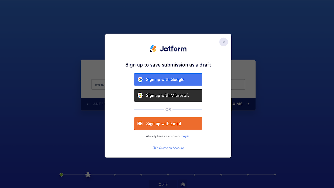Para usuários não logados ou sem uma conta Jotform, selecionar Salvar exibirá uma caixa de diálogo na qual eles poderão se cadastrar ou fazer login na Jotform para salvar o link da sessão. Também é possível selecionar Skip Create an Account (Pular Criação de Conta) na parte inferior da janela para obter a URL da sessão.