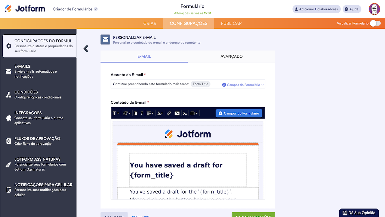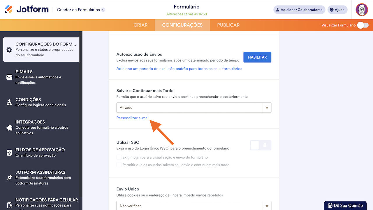 Para personalizar o e-mail que contém o link da sessão enviado aos respondentes do formulário, selecione o link Personalizar e-mail na opção Salvar e Continuar mais Tarde.