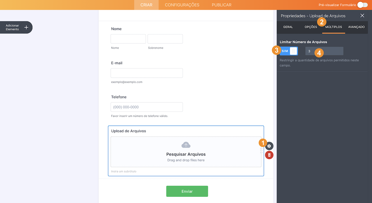 - Agora, ative a opção Limitar Número de Arquivos para habilitar esse recurso no campo de Upload de Arquivos.