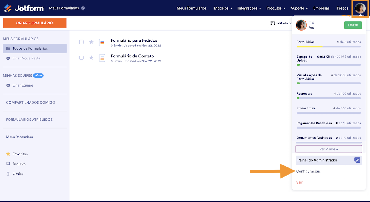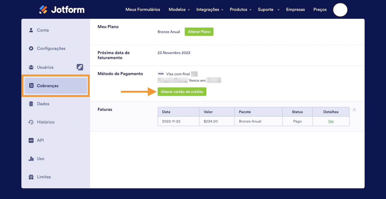 Para remover um método de pagamento da sua conta, entre em contato com o Suporte da Jotform.