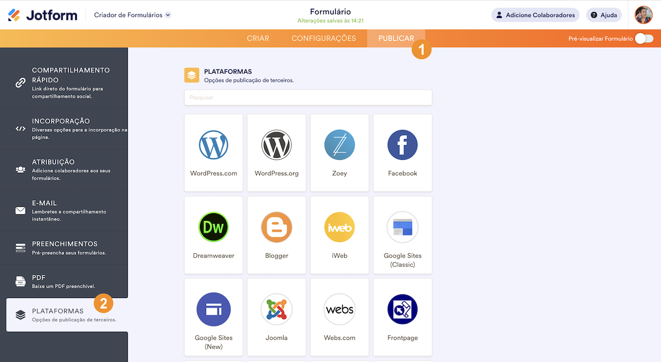 Também existem maneiras específicas de incorporar seu formulário em outros criadores de sites e plataformas de CMS. Se estiver usando uma, acesse Publicar e selecione Plataformas no menu de navegação à esquerda.