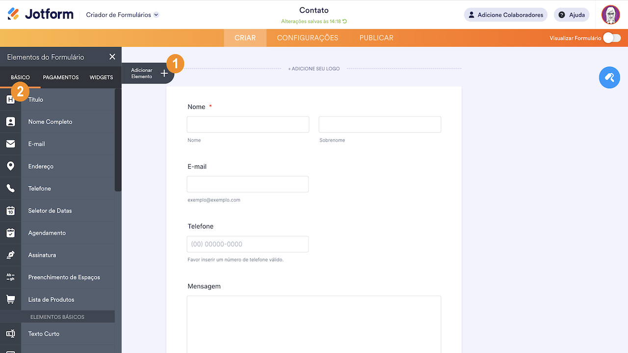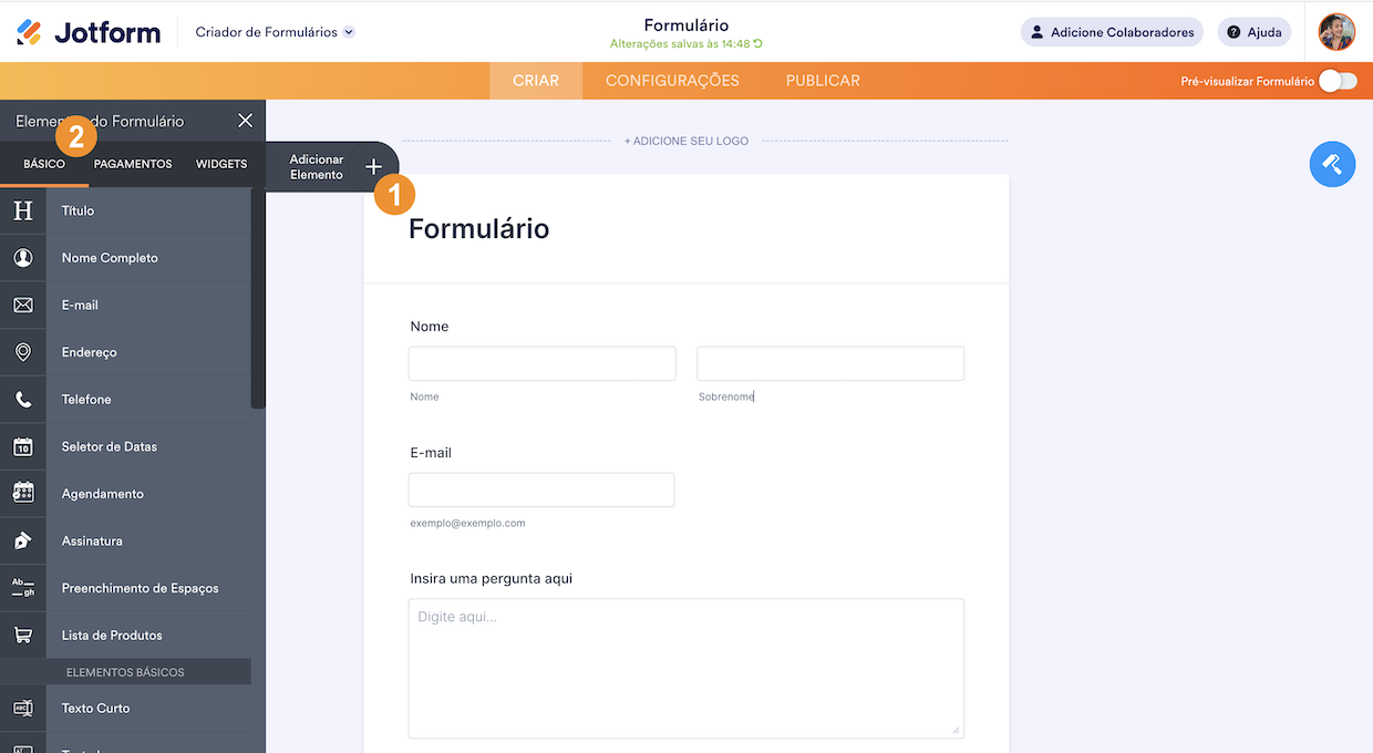 - No Criador de Formulários, clique no menu Adicionar Elemento no lado esquerdo da página para ver a lista completa de elementos e widgets.