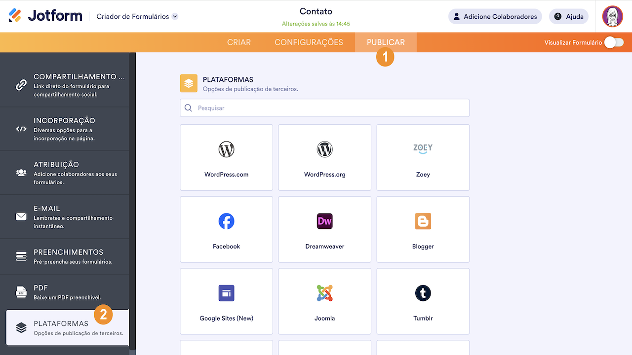- No Criador de Formulários, na barra de navegação laranja no topo da página, clique em Publicar.