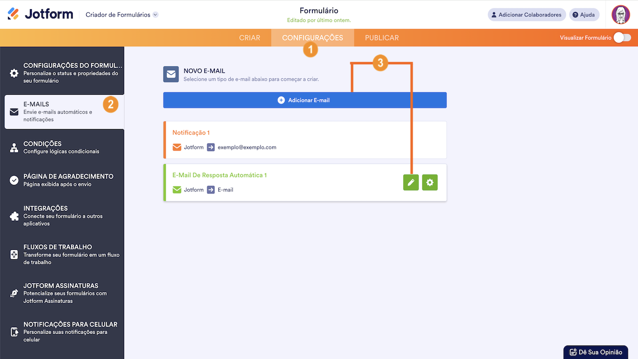 O Criador de Formulários cria automaticamente um E-mail de Resposta Automática quando você adiciona o primeiro campo de e-mail ao seu formulário. Para criar ou editar seu e-mail automático, faça seguinte: