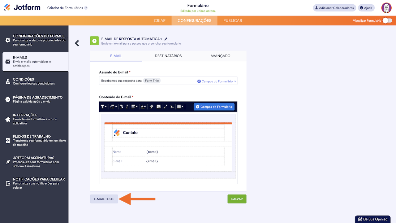 - Use o botão E-mail Teste para revisar a mensagem e confirmar que está tudo correto antes de salvar.