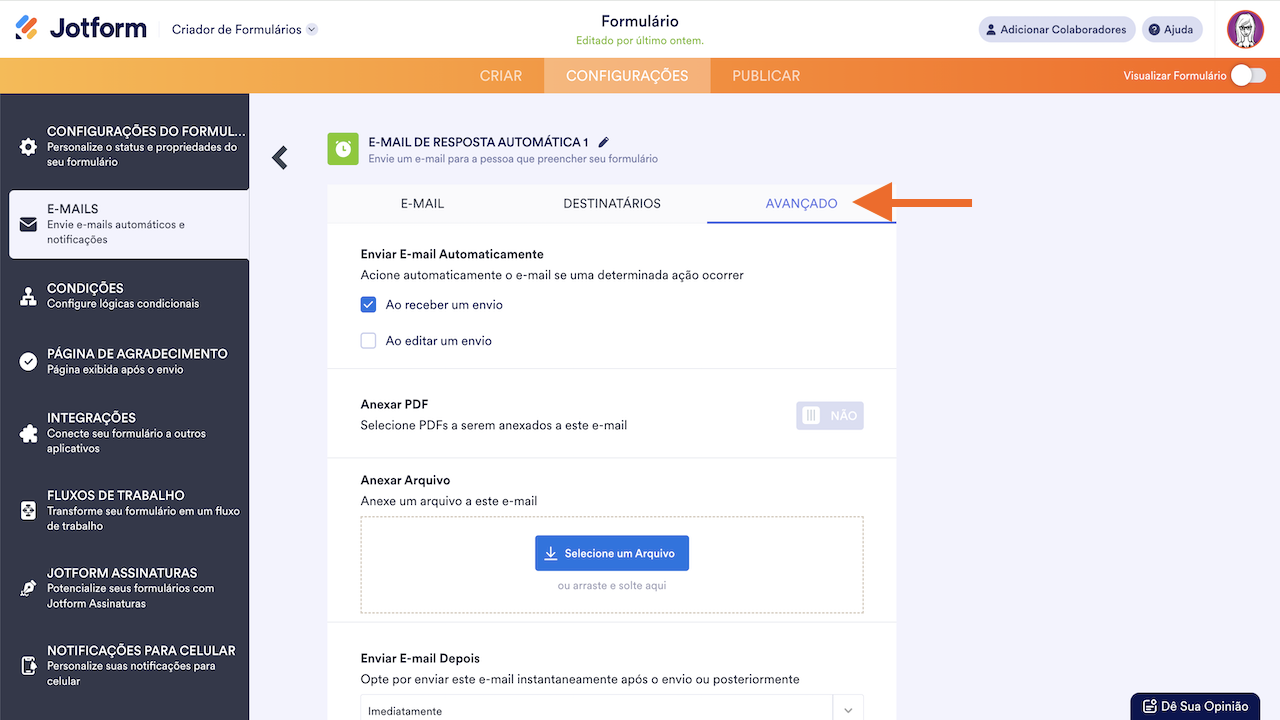 - Enviar E-mail Automaticamente — Marque a caixa para acionar o envio automático quando uma ação específica ocorrer. Você pode escolher entre dois gatilhos: ao receber um envio ou ao editar um envio.